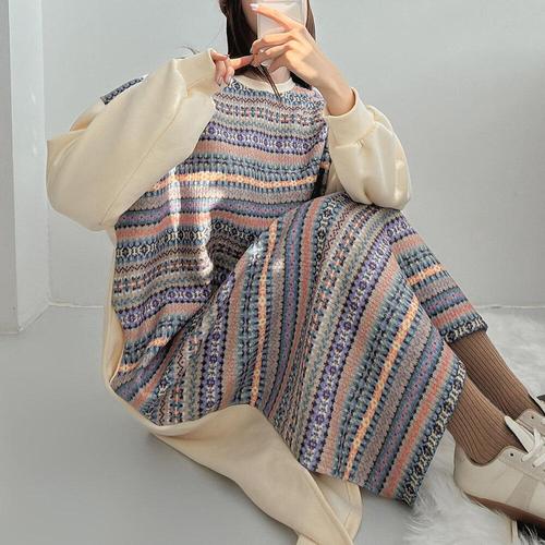 [미라클세븐]여성용 배색 롱원피스 빅사이즈 패턴 니트 옆트임 스웨터