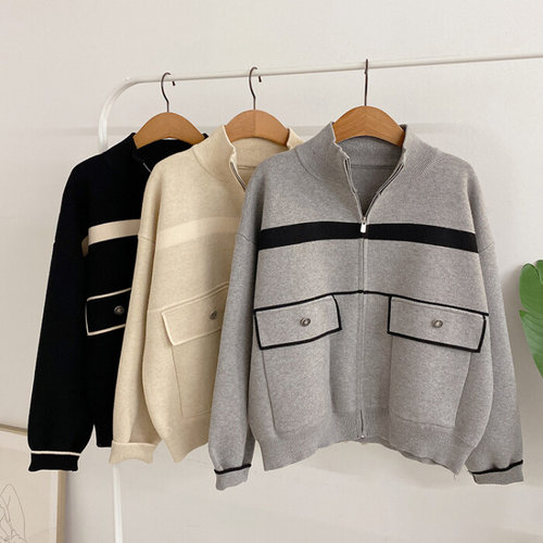 허니제이 / 코멜 빅포켓 배색 블루종 니트 집업 자켓(3color)