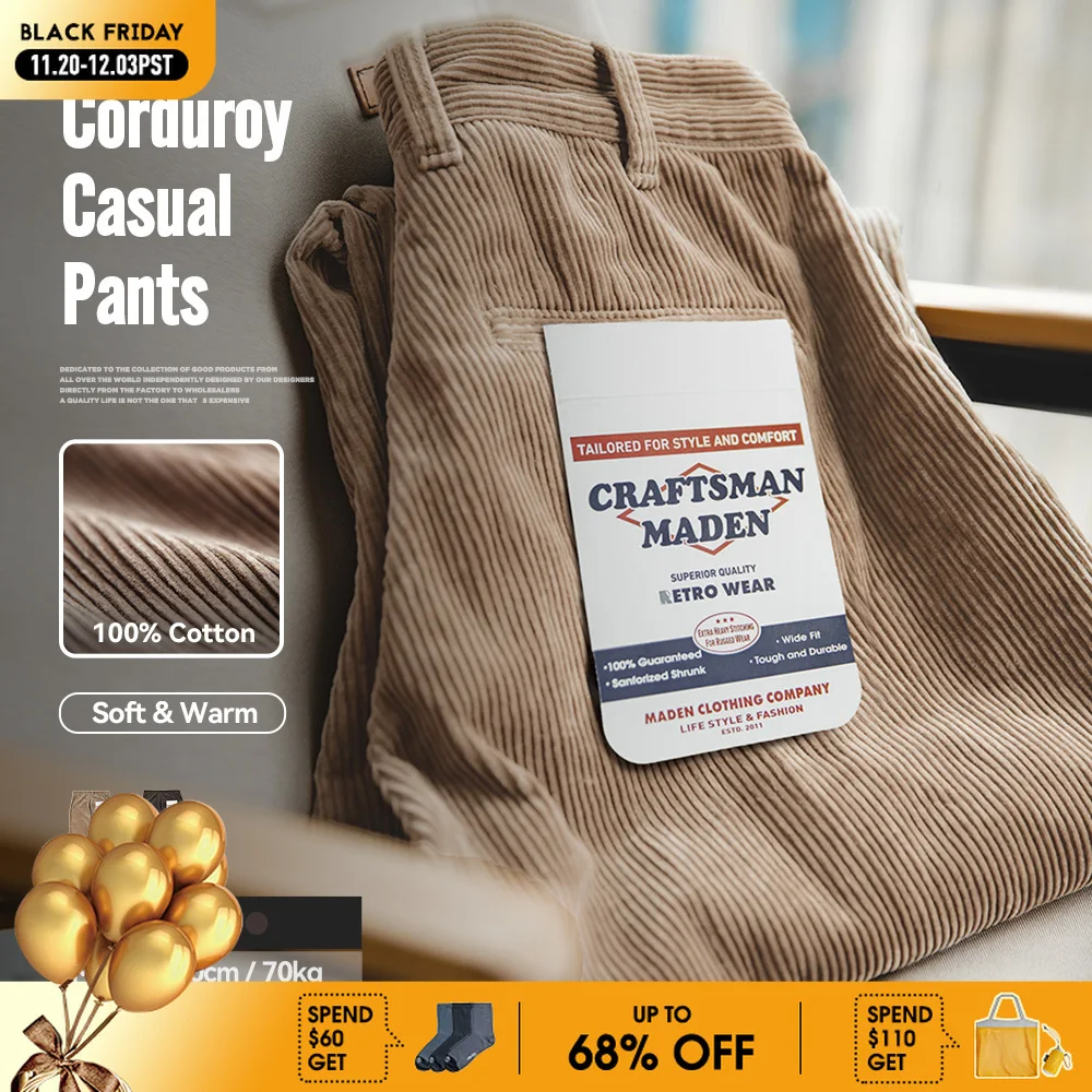 Maden 빈티지 루즈 코듀로이 바지 와이드 레그 미드 웨스트 스트라이프 벨벳 스트레이트 레그 팬츠 남성 가을 카고 바지