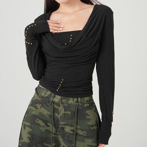 [세트/스터드장식] 버킷 크로스 블랙 튜브탑 & 카울넥 긴팔 티셔츠 레이어드 셋업