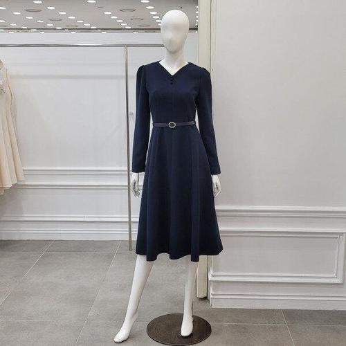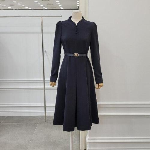 [샵앤]여성 하객룩 카라넥 허리 뒷밴딩 오픈 단추 플레어 미디 롱원피스 CAT-WDR-12097-네이비