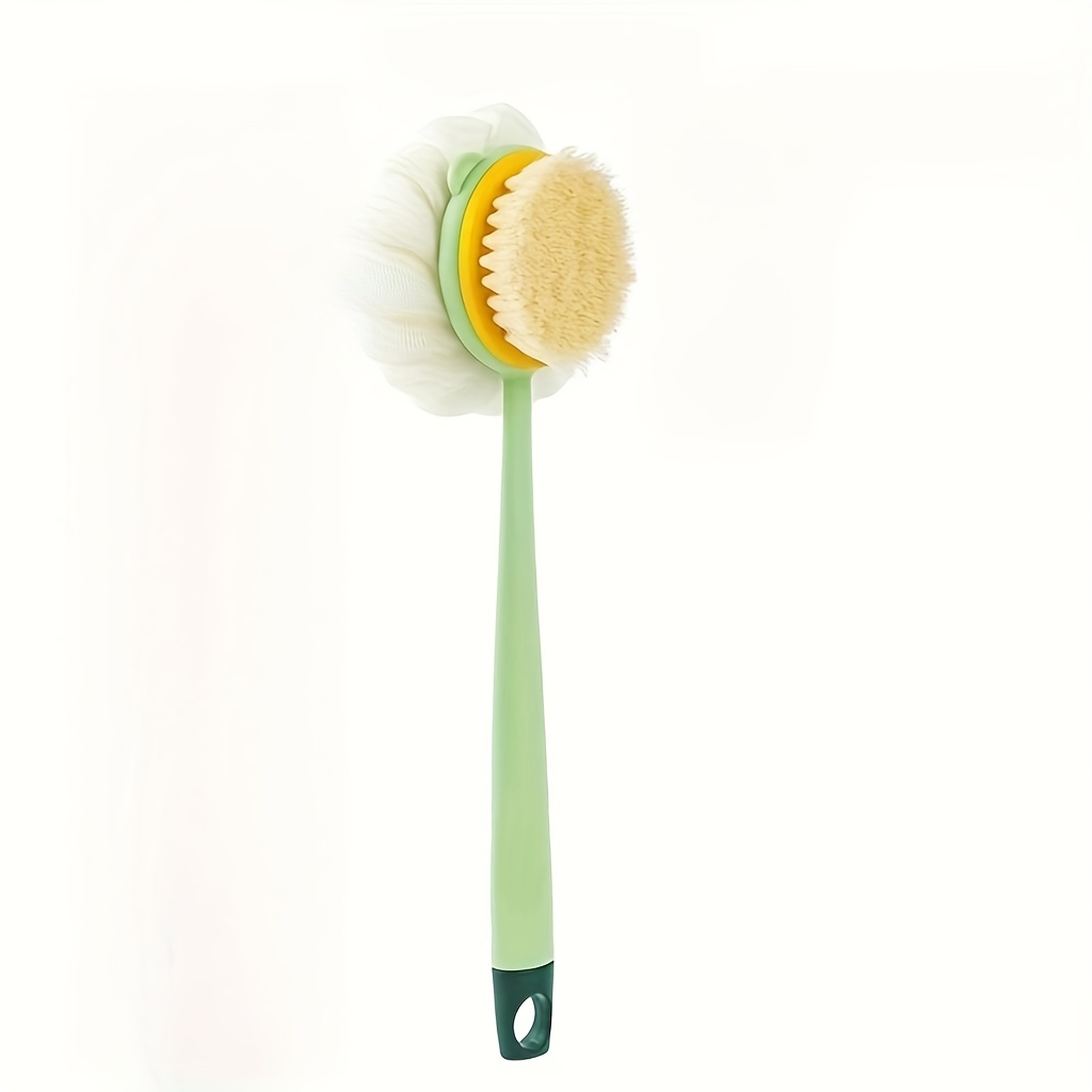 TEMU 2-in-1 긴 손잡이 샤워 바디 브러쉬 (벨벳 & 루파), 편리한 접근 및 각질 제거를 위한 곡선 디자인, 라이트 베이지, 남녀 공용, 핑크 앤 옐로우