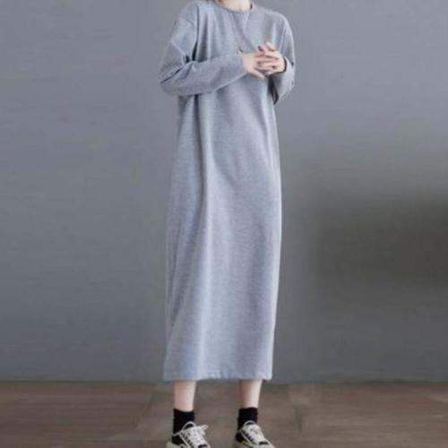 [옷자락]여성 캐주얼 무지 라운드넥 긴팔 롱 원피스