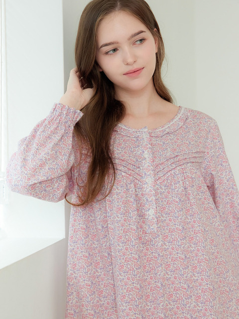 베이비핑크잔꽃 긴팔 약기모 순면 여성 원피스 잠옷