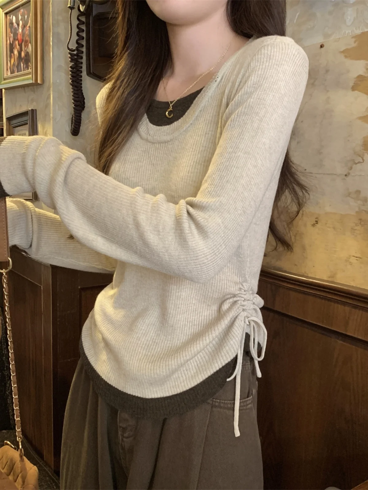 트렌디한 한국 스타일 니트 베이스 셔츠 긴팔 U넥 컬러 블록 드로스트링 페이크 투피스 여성용 탑 가을 2025