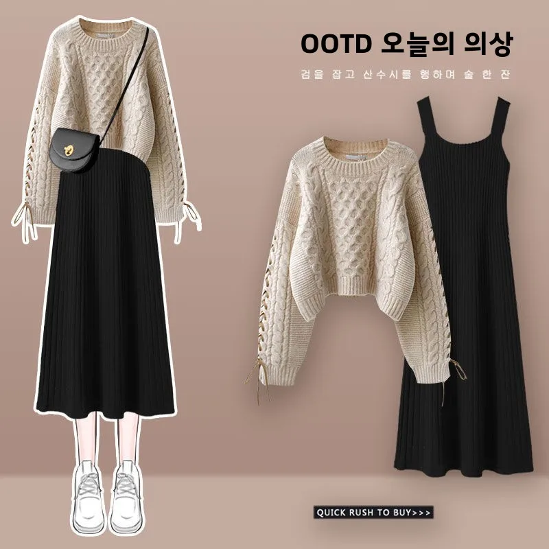 플러스 사이즈 가을 겨울 니트 스웨터 드레스 세트 여성용 고급 패션 슬림핏 투피스 정장 출퇴근 스타일 긴팔 라운드넥
