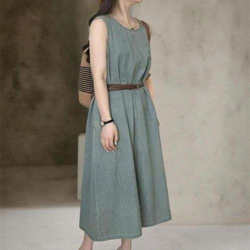 [다잇템_패션]여성 진 슬리브리스 드레스 파란색 롱 벨트포함