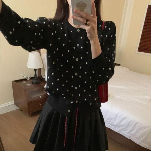 [에이치플러스몰]여성 도트 니트 라운드넥 가디건 봄가을 아우터 2색