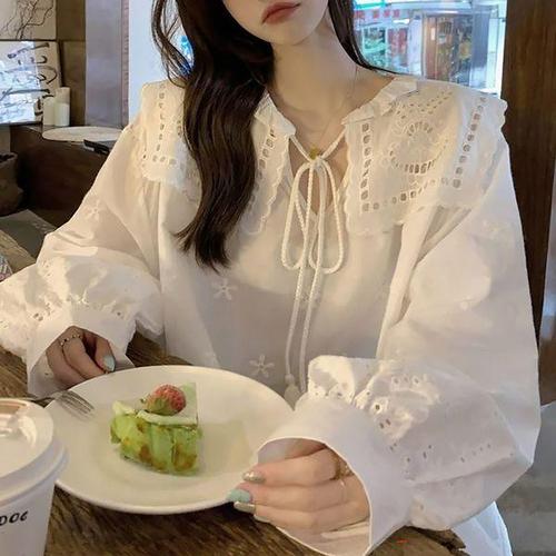 [에이치플러스몰]여성 펀칭 봄 블라우스 리본넥 빅카라 러블리 코디