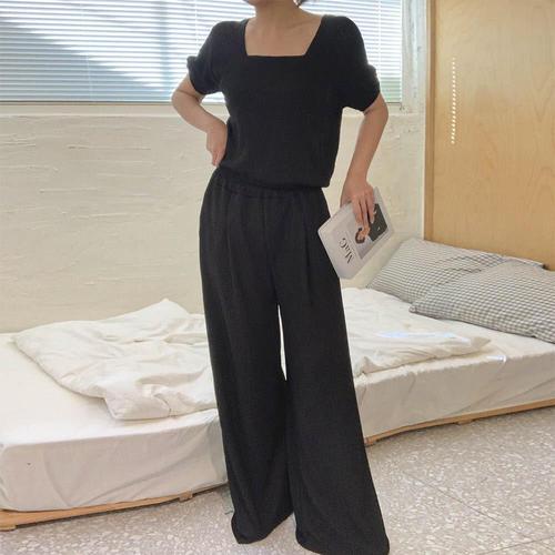 [문에이블]문에이블 여자 여성 봄 가을 간절기 빅사이즈 루즈핏 스퀘어넥 반팔 통바지 와이드 팬츠 세트