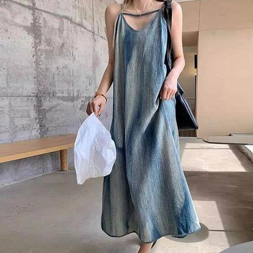 여자 봄 여름 가을 a라인 뷔스티에 민소매 끈나시 데님 청 롱원피스 간절기 썸머 등하원룩 나들이룩
