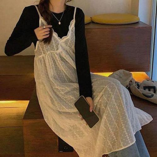 여성 여름 민소매 레이스 끈나시 뷔스티에 롱 원피스
