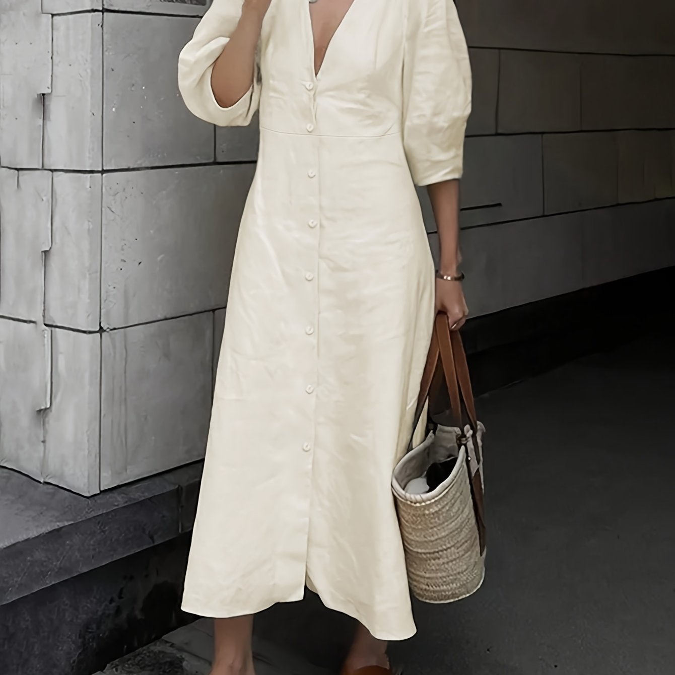 TEMU 신상 봄/여름 캐주얼 프렌치 바캉스 스타일 섹시 V넥 백리스 루즈핏 싱글 브레스트 단색 약간 푹신한 롱 드레스