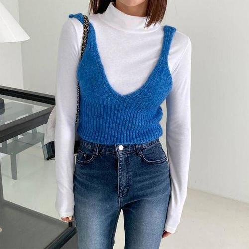 [에이치플러스몰]셔츠 브이넥 도트 끈 뷔스티에 여름 롱니트 하