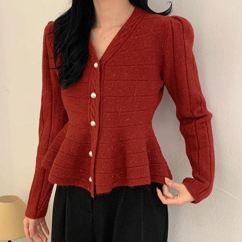 [옷자락] 여자 겨울 페플럼 단추 골지니트 꽈배기 브이넥 가디건