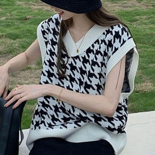 여성 봄 가을 레이어드 니트 조끼 솔리드 브이넥 베스 (WFH78UN)