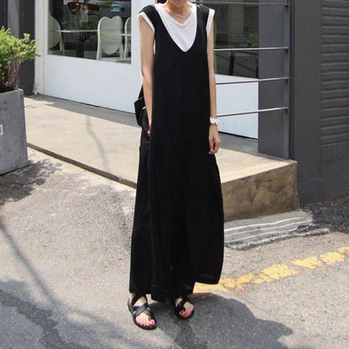 [다잇템]여자 브이 검정 와이드핏 슬리브리스 점프수트
