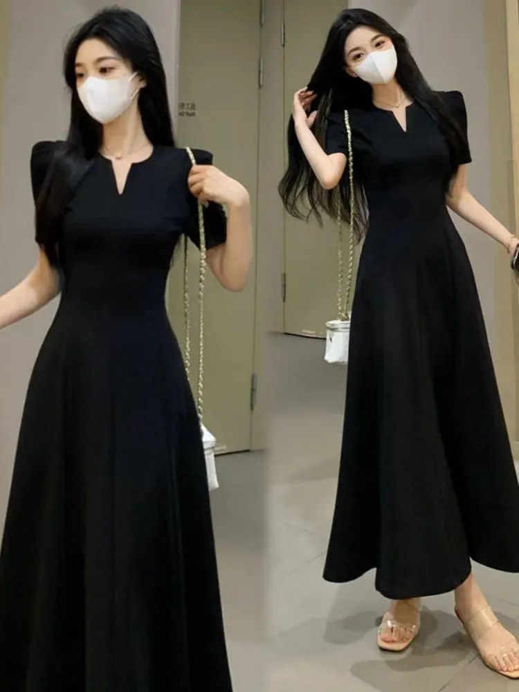 플러스 사이즈 여성용 블랙 반팔 드레스 여름 신상 하이웨이스트 A라인 롱 드레스 편안한 폴리에스터 섬유 캐주얼웨어