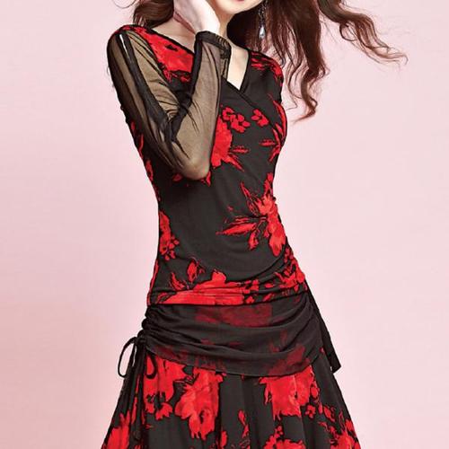[까르죠아]레드 플라워 브이넥 블라우스 스포츠 댄스복 긴팔 여성 라인 줌바 차밍 밸리 사교 라틴