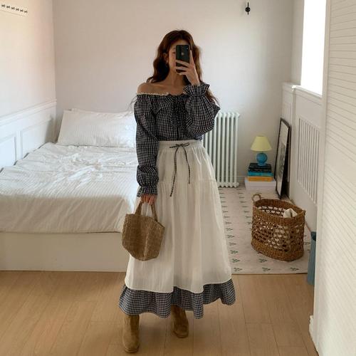 [시크블랙]뉴터성 캉캉 배색 체크 밴딩 롱스커트