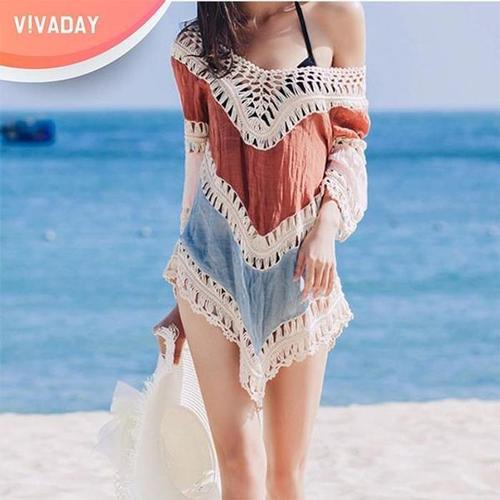 [에이치플러스몰]VIVA-I62 배색 오픈워크 미니비치원피스