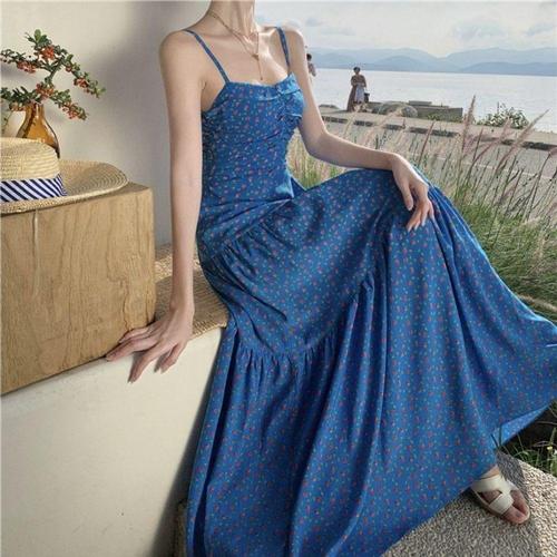 홍언목요 여성원피스 블루 유화 플라워 나시 원피스 휴양지룩 바캉스 비치웨어 롱 원피스