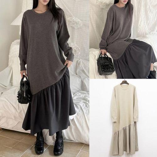 여성 기모 겨울 롱 원피스 맨투맨 후드 루즈핏 오버핏 빅사이즈 홈웨어 A라인 박시 면 라운드 플레어 니트