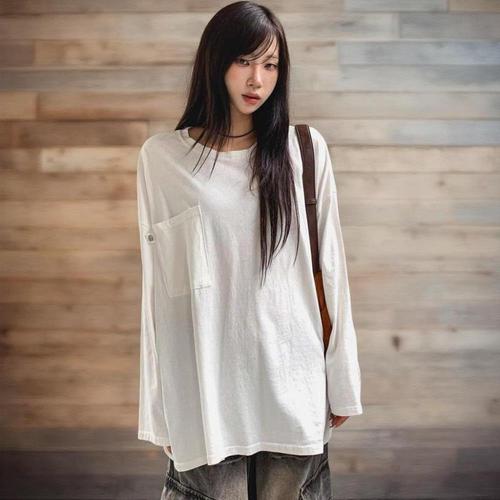 [미라클세븐]여성용 빅사이즈 패치워싱 긴팔 티셔츠 심플 포켓 디자인