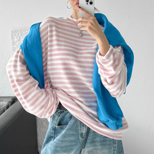 ROYALBELLE 여성 빅사이즈 스트라이프 레이어드 루즈핏 라운드넥 긴팔 버튼디테일 캐주얼 데일리 맨투맨 D00100301
