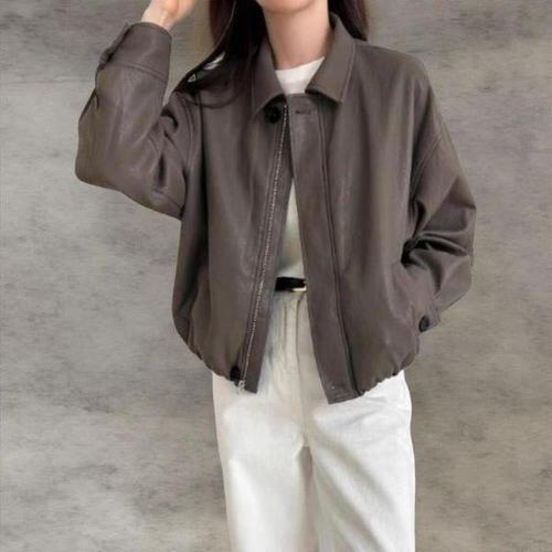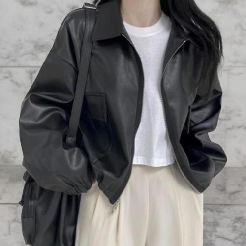 [다잇템]여성 빅사이즈 레더 카라넥 힙무드 자켓