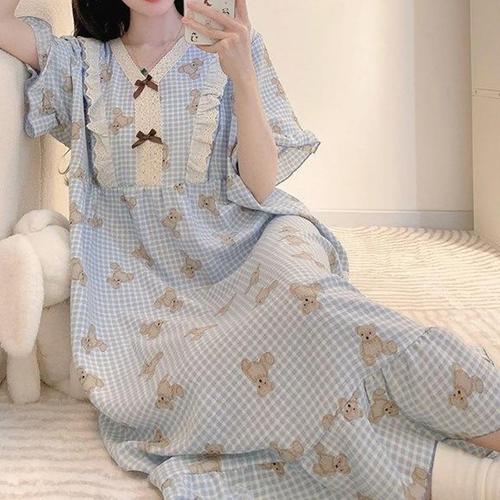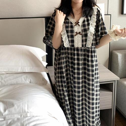 조니 빅사이즈 여름 레이스 브이넥 면 원피스 잠옷