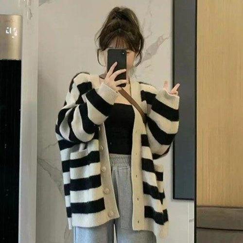 [페리엠]니트 아우터 루즈핏 스트라이프 빌리니트가디건