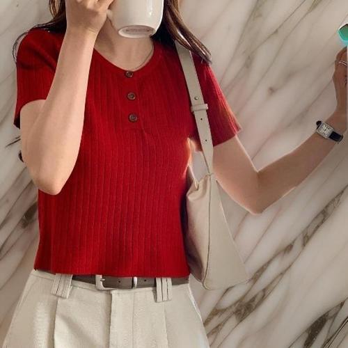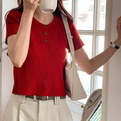 여자 크롭 골지반팔티 빨간색 라운드 니트