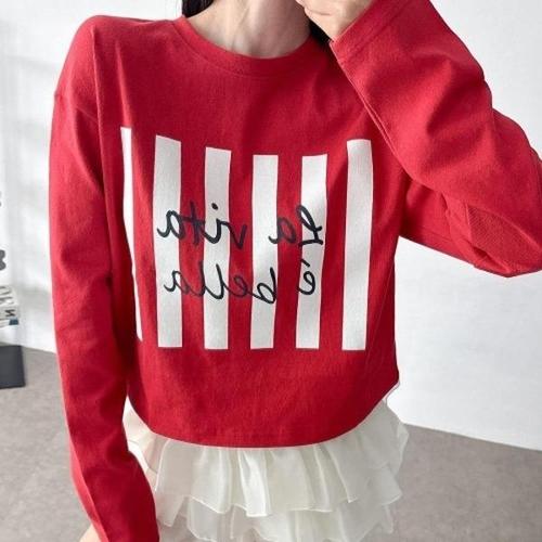 [다잇템][다잇템] 여자 크롭긴팔티 캐쥬얼 콘트라스트 빨간색 박시핏 티셔츠_20525281_588872