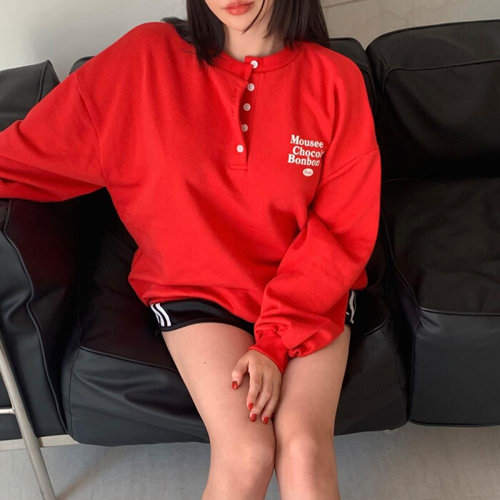 [옷자락] 여자 빨간색 반버튼 헨리넥 레터링 오버핏 가을 맨투맨