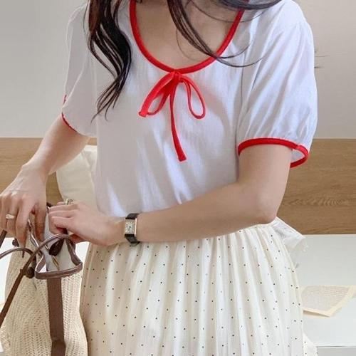 [다잇템][다잇템] 여자 빅사이즈 빨간색리본 반소매 콘트라스트 링거라운드 티셔츠_21845721_588872