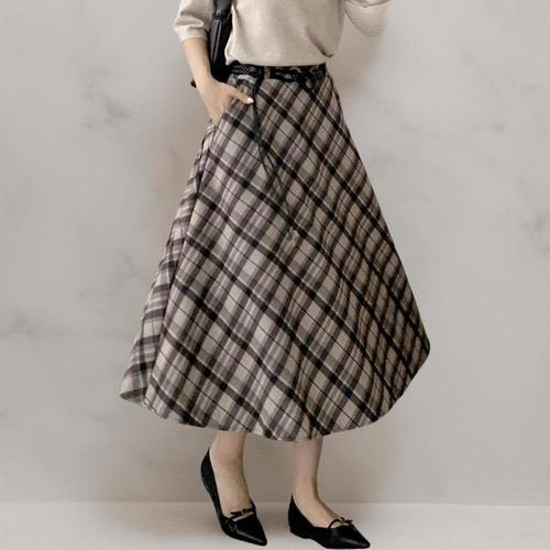 [신상오픈런]여성 가을 하객 스타일 사선 체크 벨트 플레어 롱 스커트