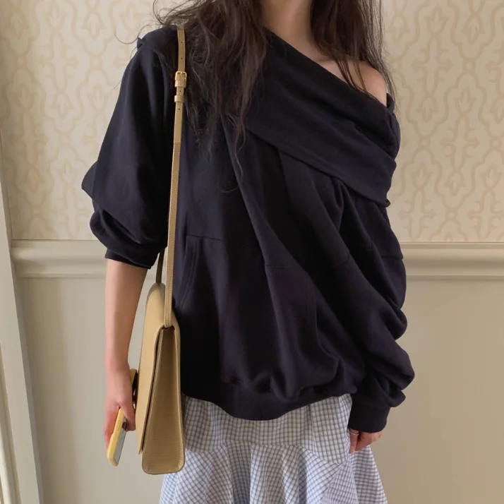 귀여운 캥거루 포켓 후드 숄더 베어드 코튼 블렌드 디자인 센스 여성용 스웨트셔츠 캐주얼 출퇴근 스타일 레귤러 길이