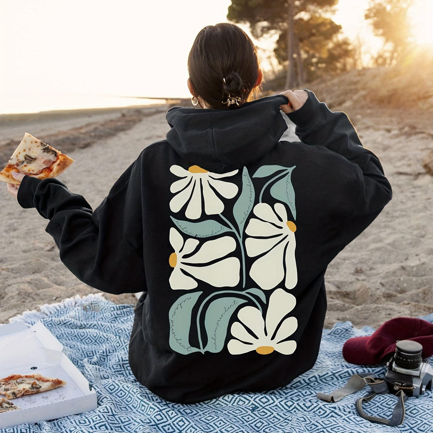 TEMU 겨울꽃잎, 여성용 아늑한 꽃 & 식물 프린트 후드티 - 가을/겨울용 캐주얼 끈 조절 풀오버, 세탁기 사용 가능