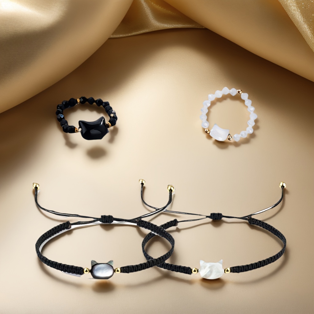TEMU 고양이 테마 비즈 반지 4개 세트 및 직조 팔찌, 빈티지 귀여운 조절 가능한 주얼리, 고양이 참 장식이 있는 탄성 있는 블랙 비즈 반지, 할로윈/크리스마스 선물로 완벽, 일상 외출 및 파티 액세서리에 적합, 가족을 위한 이상적인 선물