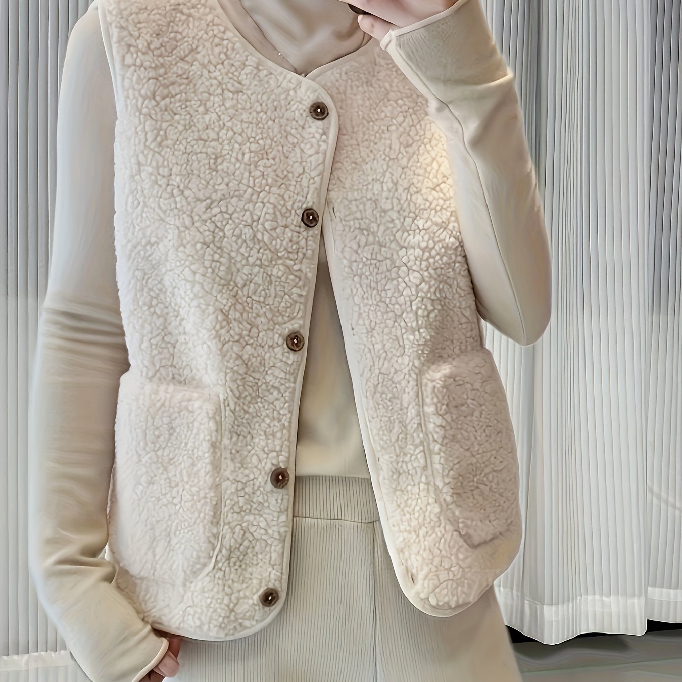 TEMU 여성용 버튼 달린 램 베스트, 부드러운 플러시 텍스처, 니트/셔츠 레이어링에 다용도, 하이넥 또는 라운드 칼라 스타일 - 겨울 & 봄 아우터웨어, 패셔너블한 귀여운 코트, 솔리드 컬러 듀얼 포켓, 여성용 베스트, 니트 레이어링 아이템, 우아한 디자인, 손세탁 전용, 포근한 텍스처, 성인 의류|나시티|셔츠|민소매