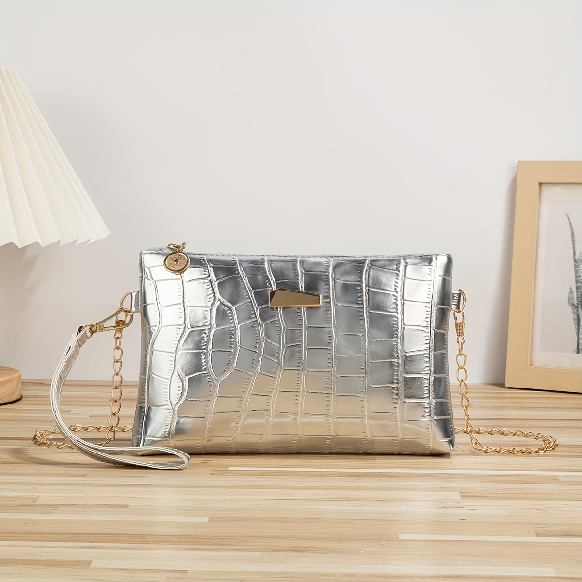 TEMU 여성용 골드 체인 스트랩 크로커다일 무늬 PU 손목 지갑, 실버 그레이 단색, 지퍼 잠금, 폴리에스터 안감, 유럽 스타일 이벤트 핸드백
