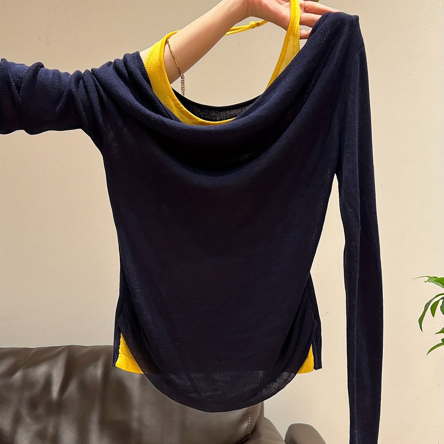 TEMU 여성 컬러 블록 플리츠 긴팔 티셔츠 - 네이비 & 마스틱 옐로우 대비, 루즈핏 오프숄더 넥라인, 신축성 있는 원단
