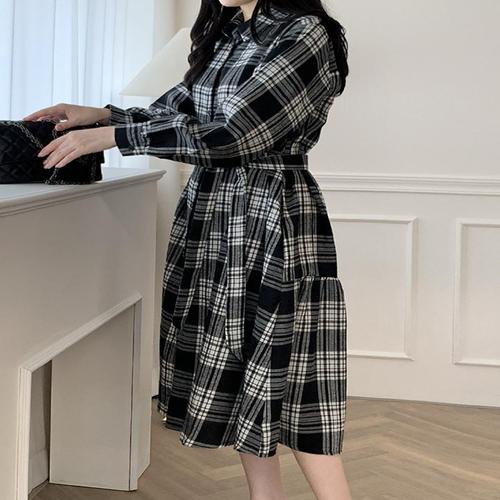 [애비뉴투지]엄마옷 고방 체크 셔츠 카라 단추 주머니 봄 가을 긴팔 롱 원피스 + 허리벨트 K10545