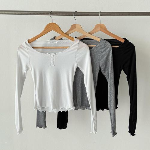 [옷자락] 여성 여리핏 나팔 소매 골지 버튼 슬림 시스루 티셔츠