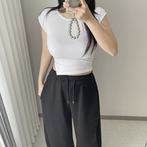 글램핏 / 모달 사선 트임 3부 셔링 슬림핏 스판 캡소매 나시 반팔 티셔츠 3컬러