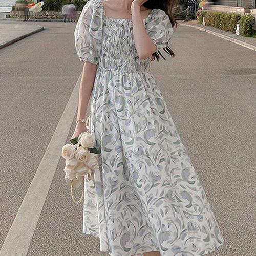 러블리 플라워 여성 스모크밴딩 퍼프소매 반팔 원피스 WFIXA95