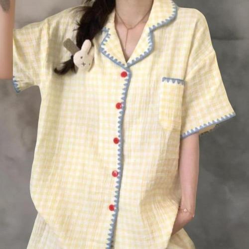 [옷자락] 여성 홈웨어 체크 포켓 티셔츠 반팔 반바지 수면복 세트