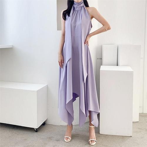 [바이어스]여신 리본 홀터넥 훌 쉬폰 러플 언발 롱 원피스 (9951813A)