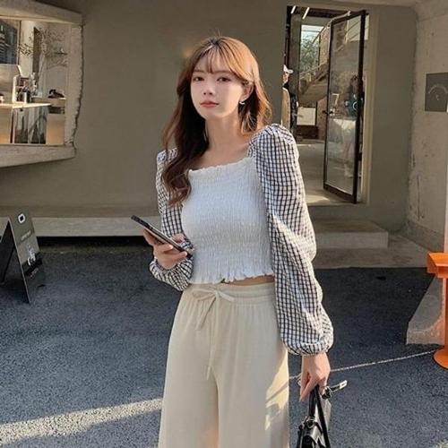 [엄지척]프릴 스모크 밴딩 체크소매 숏 블라우스_19645880_667501
